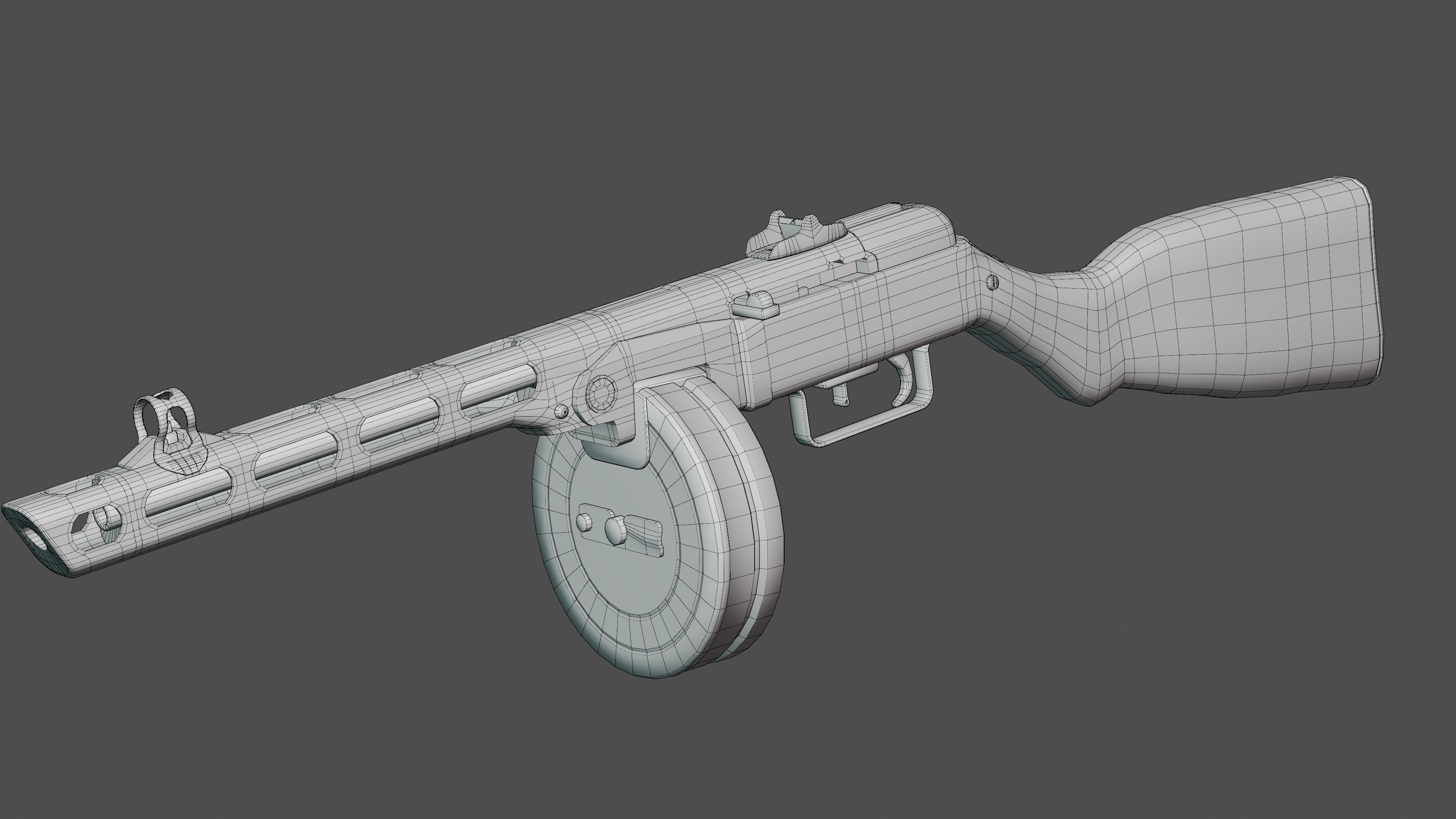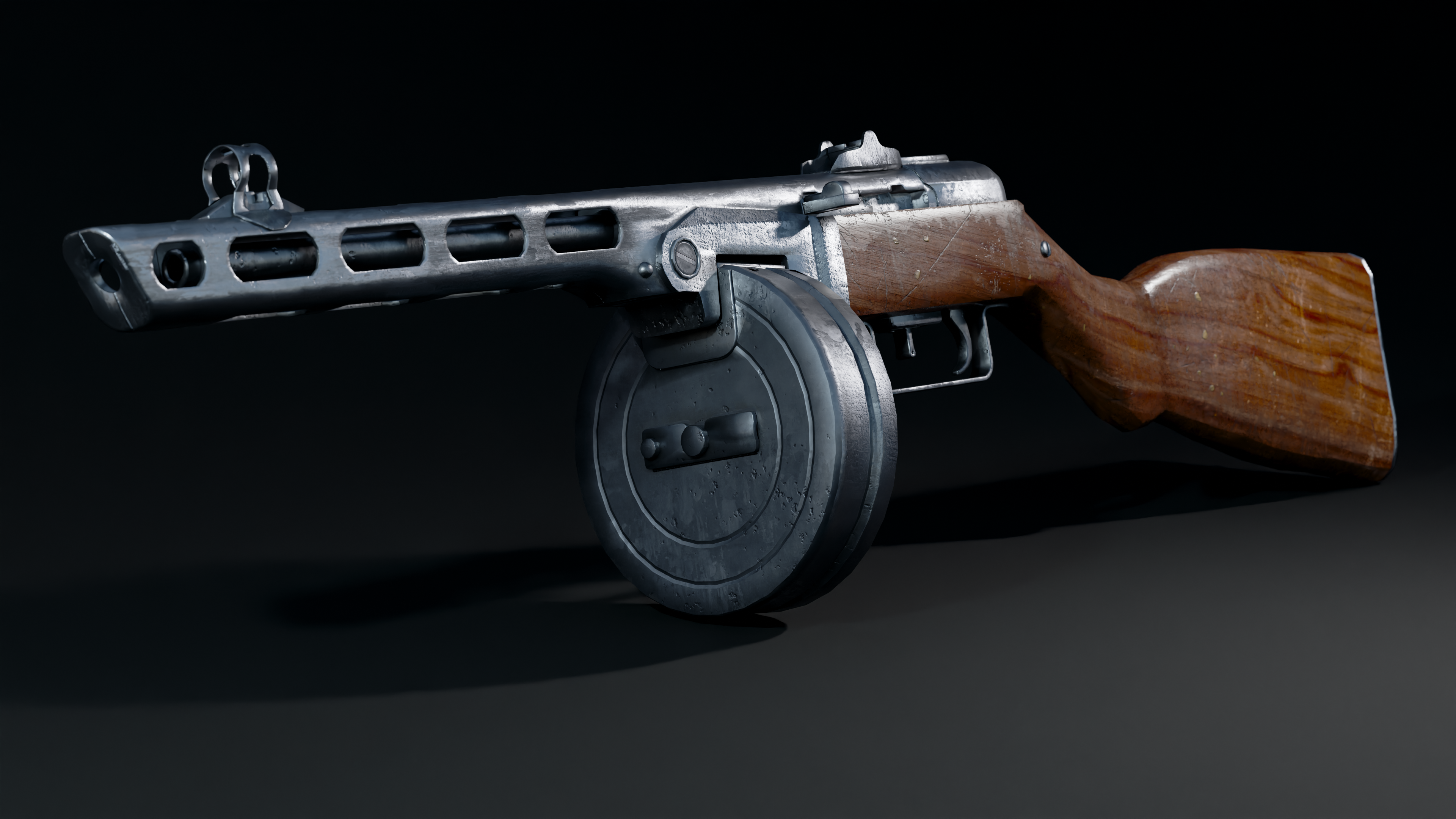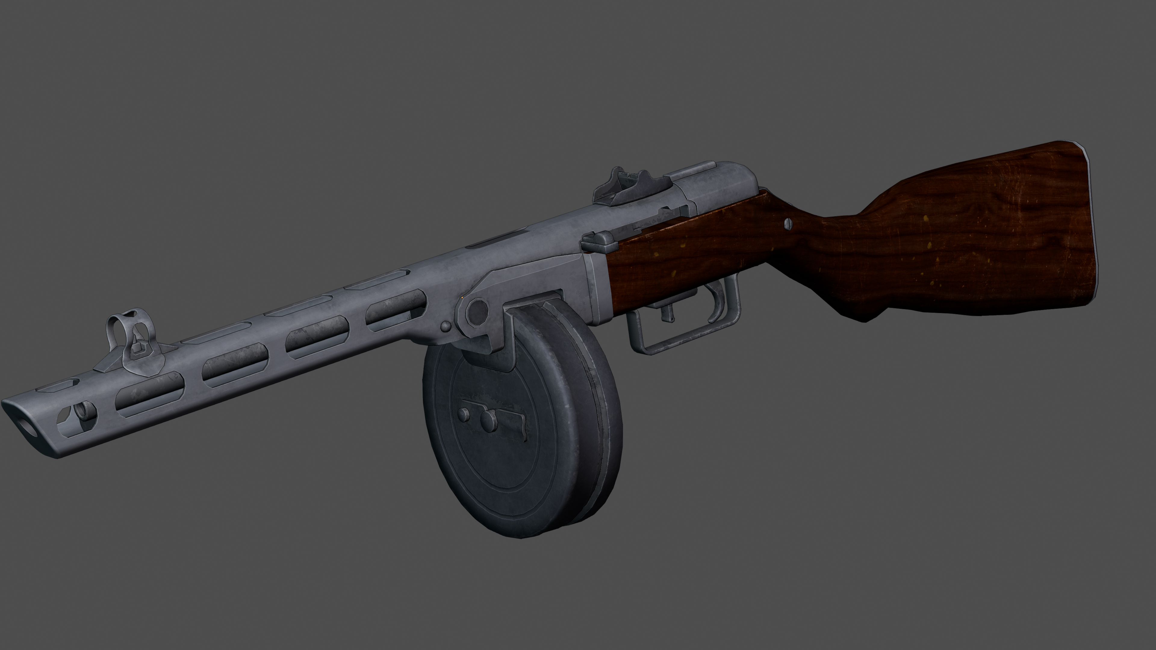 This PPSh-41 modelĀ is low-medium poly and game ready with high amounts of details and hand painted textures. This is also a fully sub-dividable model allowing for higher details if called for (cinematic shots). This model was made in conjunction with other weapons I was making, I decided that if I'm going to make weapons I should make more than one. I tried to implement a design philosophy for this project, this being since it's close up to the camera it is ideal to have a medium poly count. Although it has a medium poly count, I also made sure to have the textures use refined detail. Meaning closer up it will look better, however further away it may lose some details, especially when mip maps come into play.